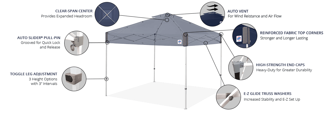 The E-Z UP® Exclusive: Pyramid™ Vented Canopy takes portable shade to a new level of cool with the auto vent for wind resistance and airflow. Set yourself apart from the crowd and settle into shaded comfort. Plus, this canopy features a clear-span center and a full 100 square feet of shade.