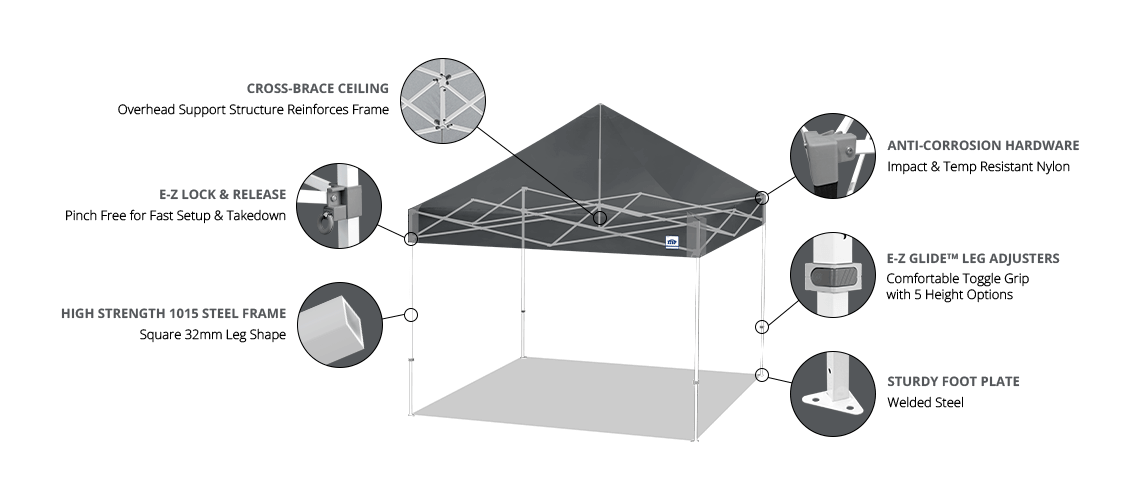 - Cross-Brace Ceiling Structure – Bolt-on canopy top anchors to reinforced cross-bracing for consistent performance and support during frequent use.